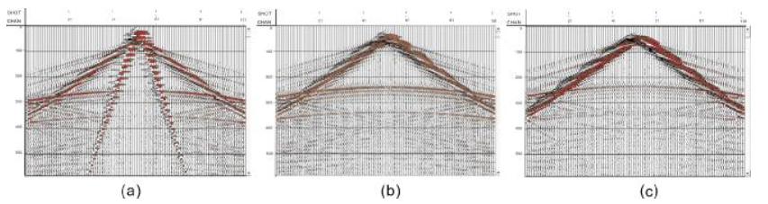 图 2 黄土覆盖区激发不同井深模拟记录 Fig.2 Seismic modeling records of different excitation well depths in loess covered area a-井深15 m, 黄土层(loess layer at the well depth of 15 m); b-井深25 m, 红土层(red soil layer at the well depth of 25 m); c-井深35 m, 红土层(red soil layer at the well depth of 35 m) |