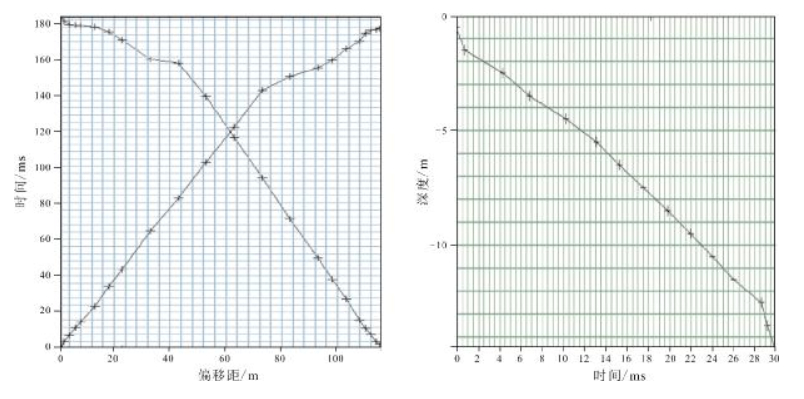 图 3 低速带调查时距曲线 Fig.3 Time-distance curves of low-velocity zone survey a-小折射法(short refraction survey); b-微测井法(micro-logging) |