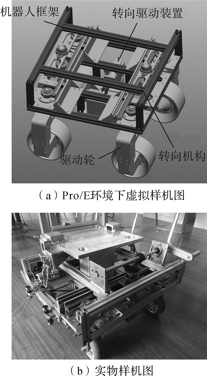 | 图 1 轮式全向移动机器人虚拟样机和实物样机图 Fig.1 Virtual prototype and physical prototype diagram of wheeled omnidirectional mobile robot |