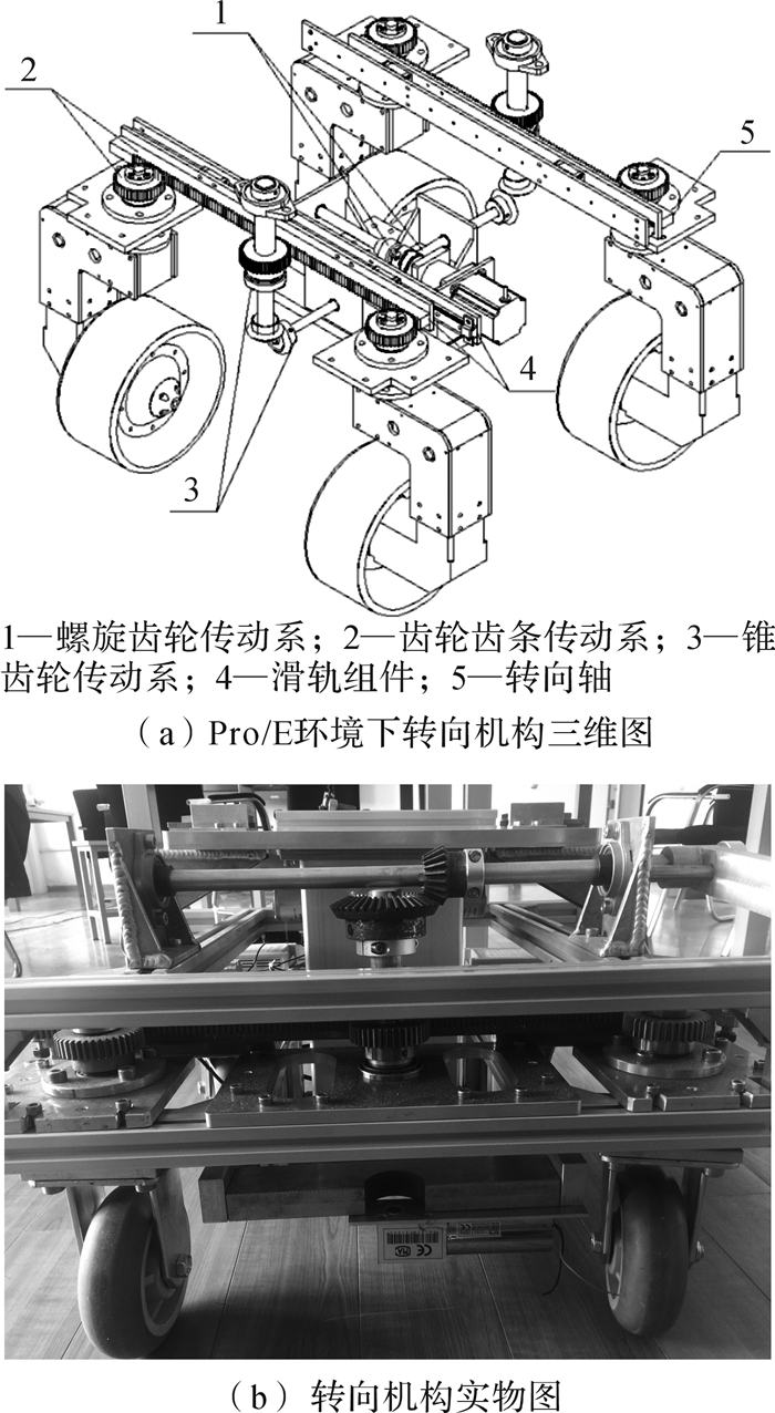 如图 3(a)所示,驱动轮同步转向机构由螺旋齿轮传动系1、齿轮齿条传动系2、锥齿轮传动系3、滑轨组件4和转向轴5组成,可以实现驱动轮0°~360°转动。螺旋齿轮传动系包括主动螺旋齿轮、从动螺旋齿轮和空间交错轴,2根交错轴异面垂直安装,主、从动螺旋齿轮分别安装在2根交错轴上。锥齿轮传动系包括主动锥齿轮、从动锥齿轮,主、从动锥齿轮分别安装在2根传动轴上配合传动,移动机器人共有2组锥齿轮传动组件,分别安装在移动机器人前、后两侧。齿轮齿条传动系包括主动直齿轮、从动直齿轮、齿条和齿条支撑板,移动机器人共有2组齿轮齿条传动组件,分别安装在移动机器人前、后两侧。滑轨组件包括直线导轨、导轨支板和支撑架,用来作为齿条滑动的移动载体。图 3(b)为转向机构实物图。