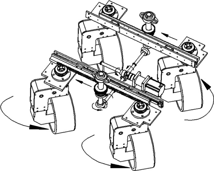 | 图 4 加入同步转向机构的轮式全向移动机器人同步转向示意图 Fig.4 Illustration of simultaneous steering of the wheeled omnidirectional mobile robot with synchronous steering mechanism |