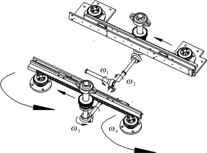 图 5为驱动轮同步转向机构简图。根据同步转向的3个传动阶段,可以得到驱动轮转向转速与转向驱动装置中步进电机输出轴转速之间的关系。图 5中各参数定义如下:ω1为步进电机输出轴瞬时转速,ω2为螺旋齿轮传动轴与电机输出轴相互配合的齿轮轴瞬时转速,ω3为锥齿轮传动中与转向轴平行的齿轮轴瞬时转速,ω4为全向轮转向瞬时转速。