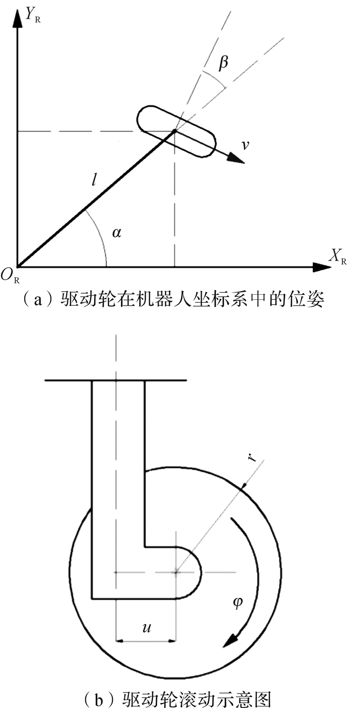式中:[l α]为各驱动轮的支撑点在机器人坐标系中的极坐标位置;β为驱动轮的转向角度;r为驱动轮半径;φ为驱动轮滚动转过的角度;