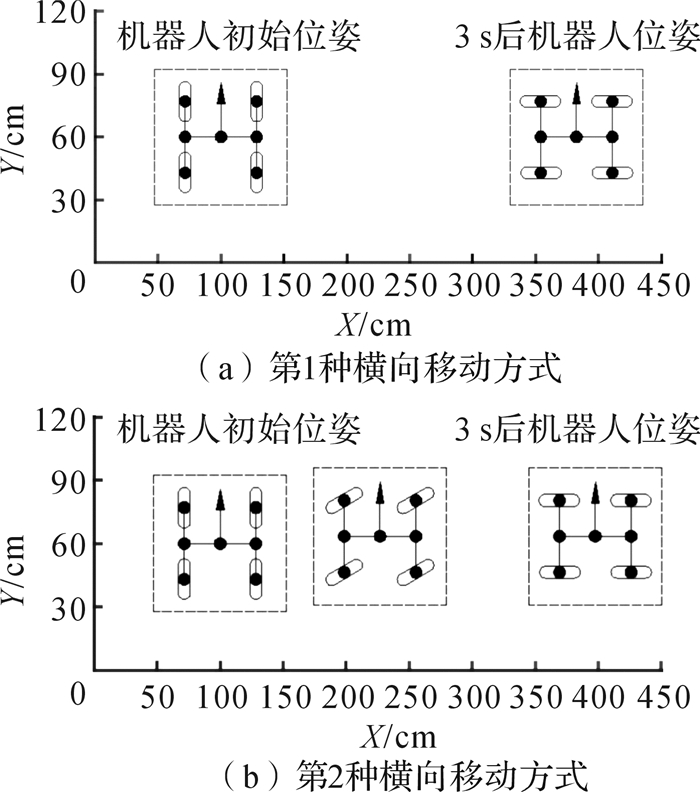 本文所设计的全向移动机器人可以通过2种方式完成横向移动:1)机器人可以先通过同步转向机构完成驱动轮的转向,驱动轮转向过程中不移动,待驱动轮转向完成后驱动轮进行移动;2)机器人驱动轮同时进行转向和移动。图 8所示为2种横向移动方式下机器人的位姿变化。