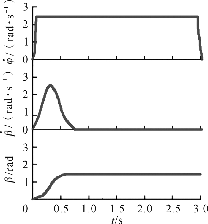 如图 8(a)以及图 8(b)所示,机器人在世界坐标系XOY中的初始位置为(100 cm, 60 cm, 0),机器人正向为Y轴正向,机器人以1 m/s的速度沿着X轴正向横向移动3 s。图 8(a)中,机器人以第1种方式在3 s内沿X正向移动距离未达到300 cm;图 8(b)中,机器人以第2种方式沿X正向移动距离达到300 cm,同时在Y正向上产生5 cm的位移。实验过程中机器人运动参数β与φ变化如图 9所示,要实现机器人以第2种方式(第1种方式较为简单,不再添加图示)完成横向移动,需要控制4个驱动轮的滚动角速度
