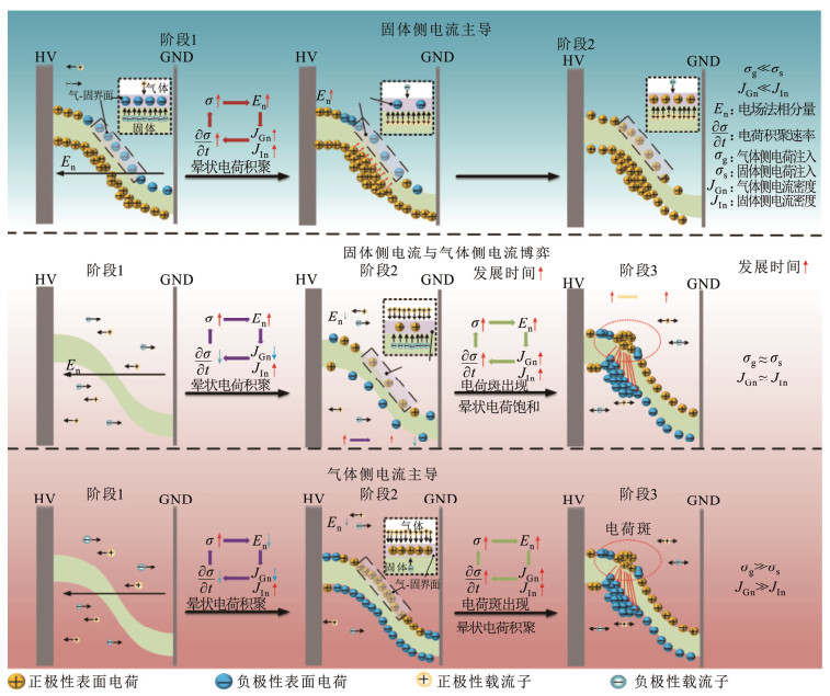 构建绝缘子表面电荷积聚模型对于理解电荷行为、指导精细化调控沿面闪络具有重要意义。通过考虑绝缘子气-固界面的固体侧体电流、气体侧体电流和沿面切向电流主导的3种表面电荷积聚机制的动态博弈关系,J.Kindersberger建立了用于计算“基本”模式下表面电荷积聚分布特征的经典数学模型[51]。华北电力大学马国明和李成榕、沈阳工业大学李晓龙等人在此模型基础上引入了电-热多物理场耦合效应,分析了温度梯度和压力变化导致的电场畸变对“基本”模式的表面电荷积聚态的影响规律[24, 52-56]。