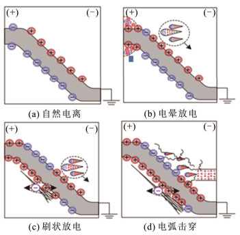 2.2 金属微粒诱发沿面闪络的发展机理天津大学梁虎成和杜伯学在60~100 kV正极性和负极性直流电压下对由0.1 MPa SF6气体填充的GIL绝缘子沿面闪络现象进行了观测,总结出绝缘子沿面闪络是一个由如图 11所示的自然电离、电晕放电、刷状放电和电弧击穿组成的4阶段过程,且沿面闪络的形成概率与绝缘子凹-凸面异侧的同极性电荷输运导致的同侧电场增强效应密切相关[62]。西安交通大学李盛涛、闵道敏等人围绕三结合点电荷发射、固体表层电荷输运、气体碰撞电离的物理过程及耦合机制,建立了基于高斯分布特征参数的绝缘子沿面闪络与失效概率分布仿真模型,并提出绝缘子固体侧电荷注入势垒和陷阱能级是影响绝缘子沿面闪络的主要电荷输运特征参数[63]。重庆大学许杭等人发现表面电荷积聚导致的场强畸变提高了局部电子有效碰撞电离系数,降低了电子崩起始所需外施场强,从而降低闪络电压[64]。而分布在电子崩发展长度内的表面电荷捕获异极性电荷和促进同极性电荷迁移,阻碍流注发展,提高了闪络电压。2种机制协同作用导致沿面闪络电压下降。