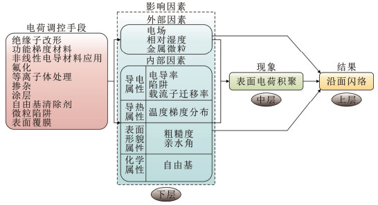 3.2 表面电荷调控方法上海电力大学王哲铭、张周胜从电荷输运过程的物理机制角度出发,引入“大坝-洪水”模型,对目前常用的氟化[79]、涂层[80]、臭氧处理[81]、粒子掺杂[82]等电荷和闪络调控手段进行了分类,提出了如图 12所示的直流GIL气-固界面介电特性的“分层式”调控体系,将抑制闪络措施归类为“疏散电荷”和“束缚电荷”2种模式,为不同理念电荷调控手段的协同作用提供了新思路[83]。