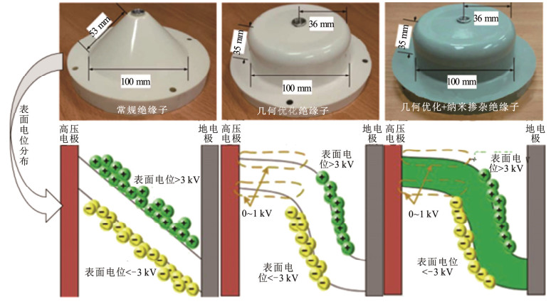 清华大学李传扬等人通过观测环氧薄片表面的电子迁移现象,发现高压电极附近的电子迁移在热梯度的作用下显著加剧,进而产生“近似绝缘失效区”,使绝缘子表面的大部分压降集中在地电极附近[23]。基于此发现,李传扬等人进一步设计了基于碳化硅/氧化铝掺杂比例优化的电荷自适应绝缘子,由中心导体周围的“绝缘区”和地电极附近的“电荷自适应区”组成,利用碳化硅的非线性电导特性,加快高电场时的表面电荷消散,以达到限制电荷积聚的效果[84-85],见图 13。文献[86]通过降低法向场强为准则的几何优化,有效减少绝缘子表面电荷积聚和粉尘吸附,并进一步通过Si/C含氟复合涂层,构建复合梯度界面绝缘体系,最终使凸面闪络电压提升了24.9%。文献[87]采用3,3’,4,4’-二苯酮四酸二酐(3,3’,4,4’-diphenylketetracylic anhydride,BTDA)提高环氧/玻璃纤维复合材料的分子链交联度,研究结果表明,少量的BTDA剂可以引入碳基,有效提高EP/玻璃复合材料的捕集水平和密度,抑制表面电荷的积累,降低表面电导率,提高闪络电压,过量的BTDA会降低陷阱的能级和密度,导致表面电荷的积累,最终提高表面电导率。当BTDA加入质量分数为15%时,表面闪络电压增加到其最大,比纯EP/玻璃材料的值高出17.3%。合肥工业大学薛建议、西安交通大学张冠军、李文栋等人通过仿真研究发现,采用绝缘子几何形状轮廓和介电分布拓扑优化的方式,可以有效抑制绝缘子表面异极性电荷的积聚,从而调控整体和高场强区域的电场分布并提高沿面闪络电压[71]。