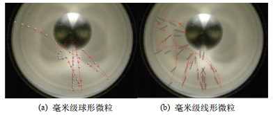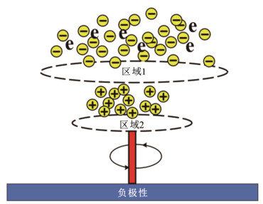 文献[10, 12]发现微粒在悬浮运动过程中也可能发生竖立现象,这一现象发生的本质是空间电荷作用。如图 3所示,微粒尖端的电晕放电削弱了区域2中电场,使其不易起跳;电子崩形成的正离子加强了前方区域1中的电场使得更容易出现局部放电。文献[9]中对半径为0.25 mm、不同长度下的线形金属微粒进行气隙击穿实验后发现,线形金属微粒若在运动后出现竖立行为,则大概率发生击穿。文献[13]对片状金属微粒的研究中发现,片状钢制金属微粒起举后会保持旋转,继续加大电压则旋转加快并略微跳起,跳动过程中微粒底端与地电极会产生微弱的火花放电。