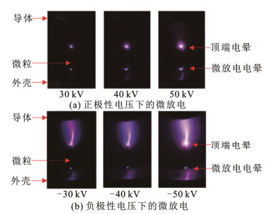 王健等人采用同轴圆柱电极对半径为0.1 mm、长度分别为2、4、8 mm及12 mm的线形微粒运动特性进行了观测。研究表明,线形金属微粒在起举后表现出不同的行为,这与其荷电量密切相关。当荷电量充足时,这些微粒会从电极表面跳起;相反,当荷电量不足时,它们则会继续停留在电极表面[11]。这一过程带有明显的极性效应,施加正极性电压时,微粒易发生站立;施加负极性电压时,微粒易跳起并站立于中心电极上。若微粒带电量不足以克服重力,则微粒会处于站立的平衡状态。站立的几率与长度相关,微粒长度增加使得其所受重力增加,旋转力矩相对更小,更容易发生站立。竖立的微粒顶端和微粒与地电极接触的底端都会发生电晕放电,如图 2所示,并且在施加负电压下更容易发生击穿。