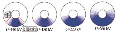 图 4 不同电压下的球形微粒运动分布仿真模拟结果[14] Fig. 4 Simulation results of spherical particle motion distribution under different voltages[14] |