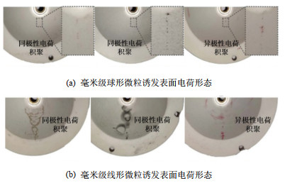 日本东京大学A.Kumada、清华大学李传扬、河北工业大学邢云琪等人利用高速摄影技术,对毫米级球形和线形金属微粒在中心电极结构的盆式绝缘子模型中的运动特性进行了观测[27-29],并通过粉尘图法对金属微粒运动过程中的表面电荷积聚情况进行了详细分析,如图 6和图 7所示。相关结果表明金属微粒的运动速度、轨迹和起举电压(针对线性微粒)等电动力学特性与原生静电场的径向分量、金属微粒的起始位置和几何形貌等因素都密切相关。李传扬等人推测金属微粒在绝缘子附近会诱发气体电离,且电离出的电荷会在绝缘子表面入陷,造成异极性电荷在绝缘子表面电荷积聚是导致沿面闪络的主要作用机制[22, 28-30]。绝缘子周围的金属微粒引发的微放电提供了额外的电荷源,影响气固界面的气体侧电荷注入,同时微粒引发的电场畸变也为沿面闪络创造了可能的路径[31]。