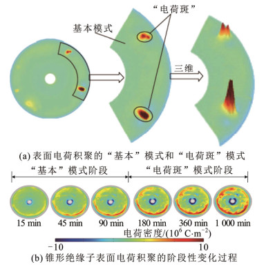 盘式绝缘子表面电荷主要积聚在绝缘子的非平面区和地电极附近,呈晕状分布,在施加–25 kV的电压下,绝缘子在靠近中心电极非平面区域积聚同极性电荷,在地电极附近积聚异极性电荷[43-44]。李成榕等人构建建立了包含SF6绝缘气体中载流子的产生、重组和扩散的DC-GIL仿真模型,并分别研究了盘式、盆式和圆头盆式3种不同形状的绝缘子表面电荷积聚情况,结果表明,圆头盆式绝缘子积聚的电荷较少[45]。J.Kindersberger、张贵新、张博雅等人在对直流电压下缩放的GIL盆式和锥形绝缘子进行表面电荷测量时发现[28, 46-47],绝缘子表面电荷积聚是一个由同极性电荷整体呈圆周对称分布的“基本”模式向个别区域出现异极性电荷簇分布的“电荷斑”模式转变的阶段性发展过程,如图 8所示。其中,“基本”模式表面电荷积聚特征主要受气-固界面的固体侧电流主导的径向电场分布情况决定,“电荷斑”模式表面电荷积聚特征主要受绝缘子本体缺陷如毛刺、气隙以及外来缺陷如金属微粒引发的电场畸变或气体侧局部放电情况决定[38]。