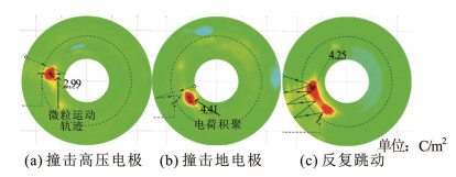 华北电力大学王健等人通过实验对比有、无金属微粒存在时绝缘子表面电位分布情况,研究发现当金属微粒黏附于绝缘子表面时,靠近中心导体的金属微粒尖端附近出现负电位区域,远离高压电极一侧出现正电位区域[31]。文献[48]通过实验研究运动状态下的金属微粒对表面电荷的影响,发现固定的金属微粒不会引起电荷积累模式的显著变化。微粒在移动过程中撞击高压或接地电极的边缘,会促进电荷积累,如图 9所示,电荷积累行为与微粒的运动轨迹和停止位置相关。