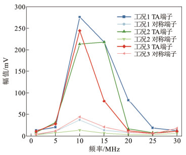 对称端子处的信号可以认为是升高座本体通过空间中的分布电容从导线中耦合产生的响应,其幅值远小于TA端子,说明套管TA在高频信号感知过程中起到了绝大部分作用。