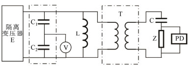 图 11中,局部放电加压装置包括隔离变压器E、无局放电抗器L、无局放交流分压器C1、C2。Z为检测阻抗,C为耦合电容。PD为局部放电检测系统,监测脉冲高频电流局放信号。