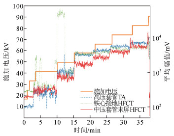 选取平均幅值作为特征量,分别绘制了高压套管TA、铁芯接地HFCT及中压套管末屏HFCT这3处局放信号随时间和电压变化的趋势,如图 12所示。