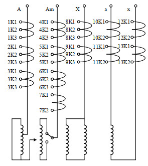 该变压器共有5根套管,分别为高压A、中压Am、低压a、低压x及中性点X,共安装有13个套管TA,绕组接线图以及TA配置如图 2所示。其中1K2表示第1个套管TA的第2个端子,其余可类推。
