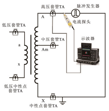 传统测试方案为依次改变信号源频率,采集各个频点处电流电压数据,进而计算互感器传输阻抗。该方案虽然简单易行但操作较复杂,效率低下。因此本文采用脉冲响应法对该500 kV变压器各套管TA的性能进行测试[15]。