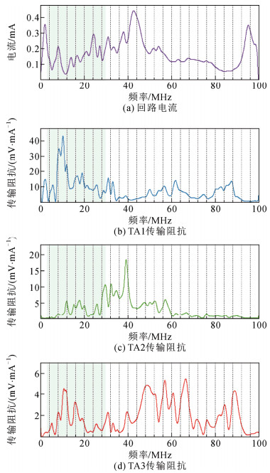 测试结果如图 4所示,可以看到在100 MHz范围内,电流频谱较为均匀,未出现局部异常过低值,由此能确保传输阻抗的测试值不会出现较大的数值误差。
