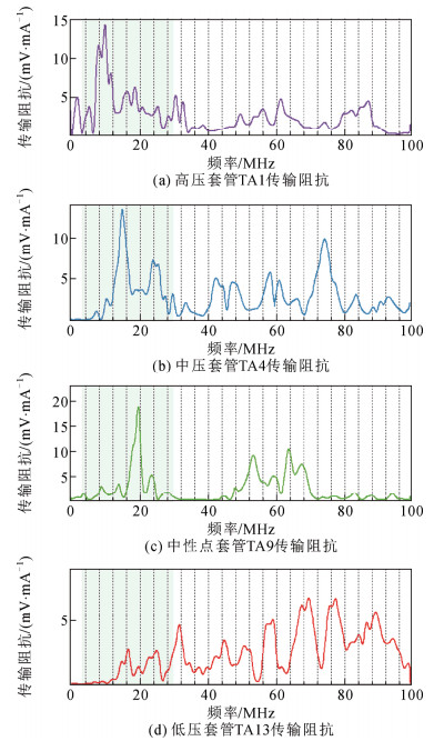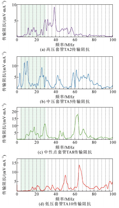 暂态TA的传输阻抗如图 6,除中压传输阻抗峰值落在10 MHz附近外,其余TA的传输阻抗峰值均在较高频段内,高压在40 MHz附近,中性点及低压峰值在65 MHz附近。在100 MHz以内,不同套管处暂态TA传输阻抗峰值均在15 mV/mA左右,且6 dB带宽大于2 MHz,足以满足高频局放传感需求。