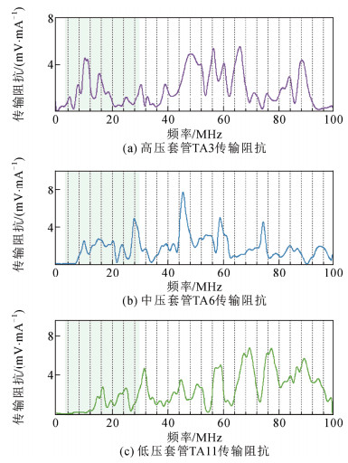 测量用TA传输阻抗对比如图 7所示,由于中性点未配备测量用TA,只比较高压、中压及低压套管。由图 7可知,测量用TA在10~35 MHz内有一传输阻抗较高区域,随着TA几何尺寸的增加向高频方向移动;在40~80 MHz频带内也有较明显传输阻抗峰值区域,但相较于保护用TA及暂态TA其传输阻抗峰值偏低。