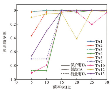 由图 8可见,在5~10 MHz频段内,超过半数的套管TA信号畸变明显,在15~30 MHz范围内除两个暂态TA在两个频点处波形畸变率异常偏低外,其余各TA在各频点处波形畸变率均小于95%。