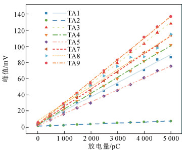 2.4 线性度测试参考企标中的相关试验要求,使用Keysight 33600 A生成一上升沿5 ns,下降沿250 ns,重频1 kHz的脉冲波,经一Clnt=1 nF的电容注入变压器对应相套管端部,中性点接地,通过调节脉冲幅值模拟不同视在放电量的放电脉冲。使用示波器采集脉冲注入相套管TA的响应信号,记录其峰峰值,测试结果如图 9所示。