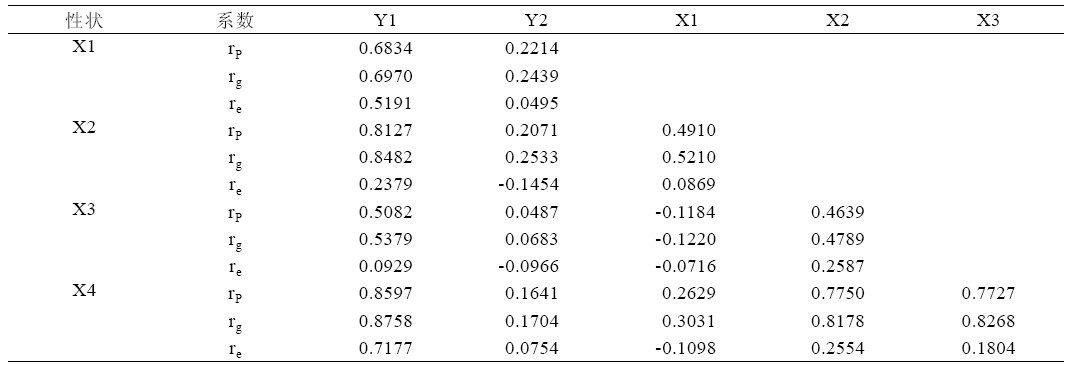 从表1 的结果可以看出,在各组性状相关中, 有些组的rg 和re 异号,有些组同号,表明基因效应 和环境效应在有的性状之间具有一定程度的差异, 有的则一致。其中,蔗汁锤度和株高的相关系数rg =0.2533,re=-0.1454,说明斑茅蔗BC1 后代在本 试验条件下,增加植株高度,提高蔗汁锤度主要是 遗传效应,而不是环境效应。而蔗茎产量和4 个产 量构成因素的相关系数rg 与re 两者都是同号,则表 明斑茅蔗BC1 后代中茎数较多、株高较高、茎径 较粗、具有较大单茎重的基因型,一般蔗茎产量也 都较高,而且能增加这些性状的栽培措施,一般也 能增加蔗茎产量。
