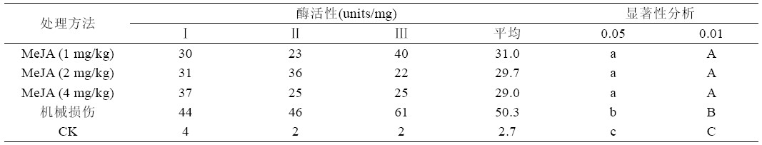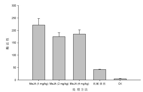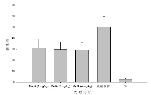 从甘蔗生长点组织中PPO 活性分析结果,可 以看到,甘蔗经茉莉酸甲酸和机械损伤处理后,生 长点组织中多酚氧化酶活性均有显著提高,特别是 经茉莉酸甲酸处理的甘蔗,其生长点中多酚氧化酶 活性提高幅度是空白对照的35~44 倍,是机械损 伤处理的4~5 倍。在MeJA 不同浓度处理中,以 1mg/kg 对生长点中多酚氧化酶的促进作用最明显 (见表2 和图2)。