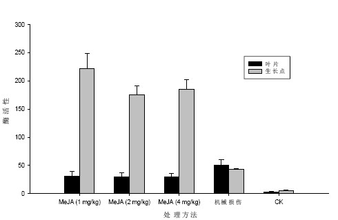 图3 显示,在对照处理中,甘蔗叶和生长点组 织中多酚氧化酶活性均处于较低的水平,在机械损 伤处理后,两者之间多酚氧化酶活性没有明显变 化,而MeJA 处理后,生长点组织中多酚氧化酶活 性明显高于叶片组织。