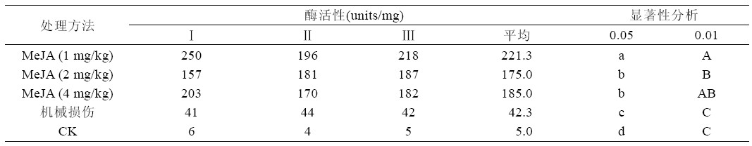 表1 和图1 为茉莉酸甲酯(MeJA) 1 mg/kg、2 mg/kg、4 mg/kg 3 个不同浓度处理与机械损伤处理 对蔗叶组织中多酚氧化酶活性测定结果。从表1 及 图1 可以看到,与空白对照处理相比,茉莉酸甲酯 不同浓度处理与机械损伤处理,可明显提高叶片中 多酚氧化酶PPO 活性,MeJA 1 mg/kg、2 mg/kg 和 4 mg/kg 处理,PPO 活性分别是空白对照的10.7、11.0 和11.5 倍,机械损伤处理,PPO 活性是空白对照 的18.6 倍。从结果比较中可看到,MeJA 3 个不同 浓度处理对PPO 活性的影响差异性不大。