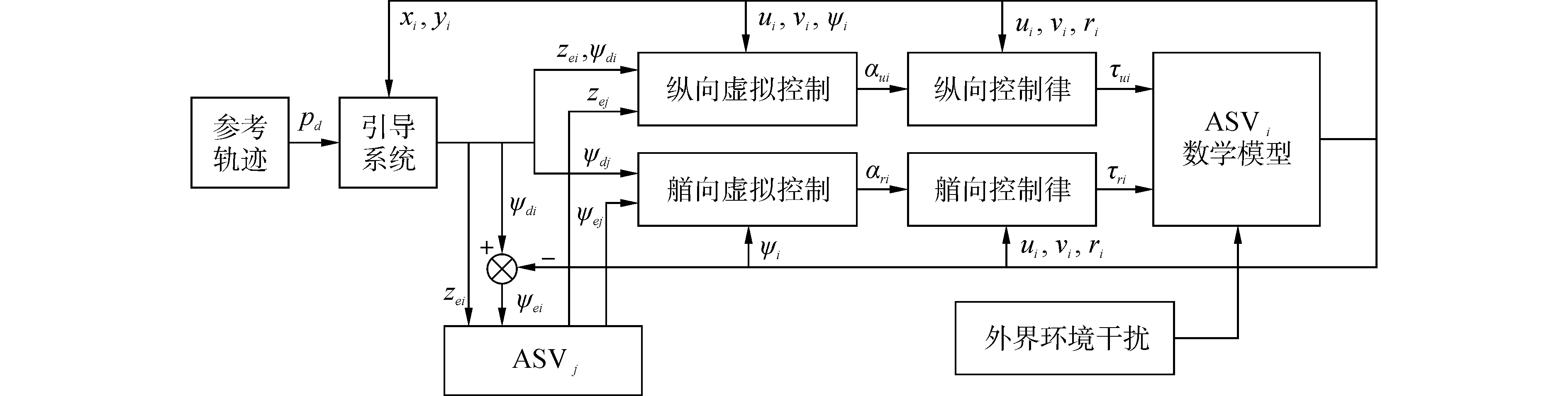 式中:(xi, yi)表示ASVi在大地坐标系下的位置信息,ψi表示ASVi艏向角信息;uivi以及ri分别表示ASVi的体坐标系下的前进速度、横移速度以及艏向角速度;m11m22以及m33表示ASVi包含其附加质量的惯性参数且均为正数;dudu2dvdv2dvrdrdr2drv表示ASVi的水动力阻尼项参数且均为正;τwuiτwvi以及τwri表示ASVi收到的外界海洋环境干扰。τuiτri分别表示船的纵向控制输入与艏向控制输入。由于ASV在侧向没有控制力矩,即本文研究的是欠驱动ASV控制问题。