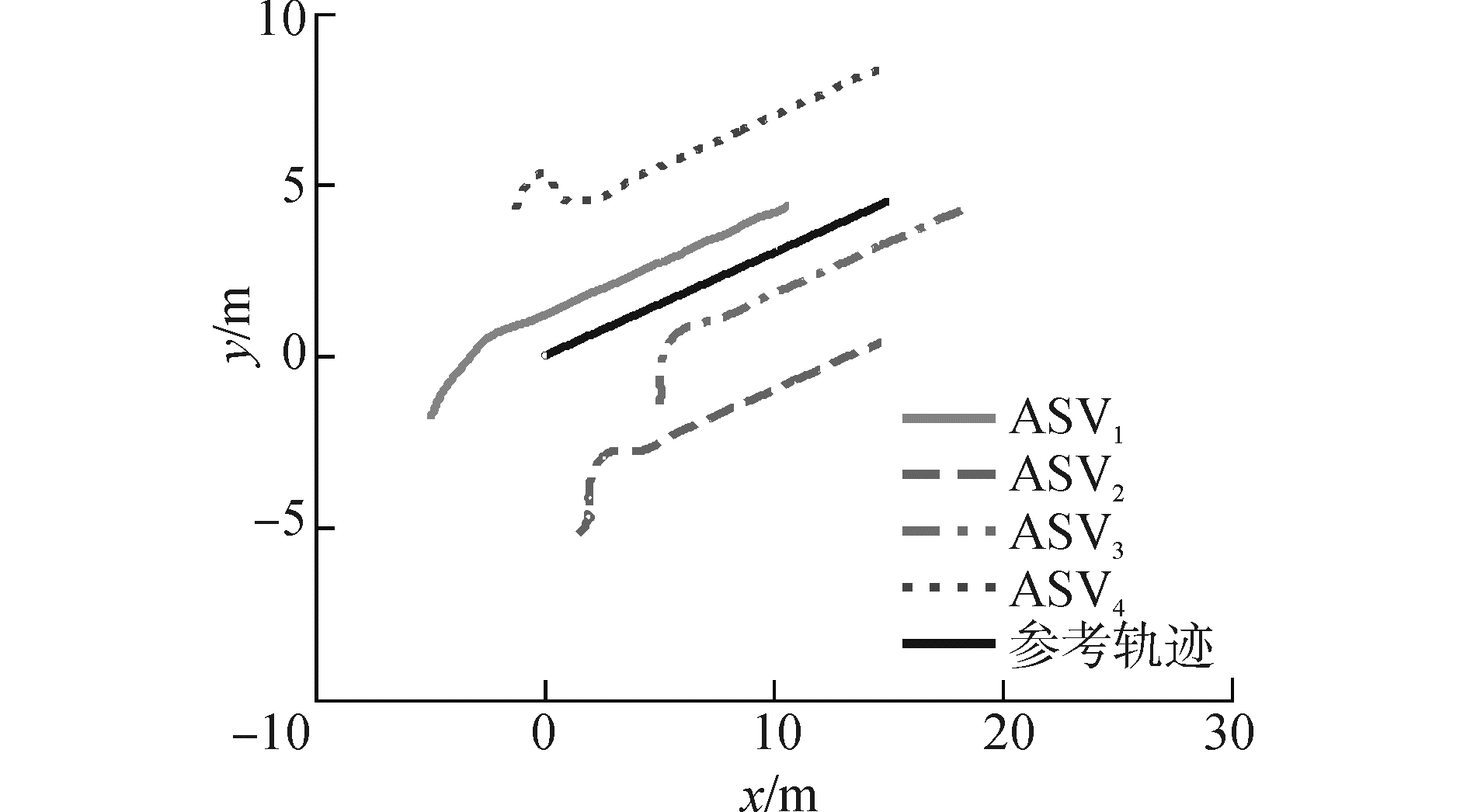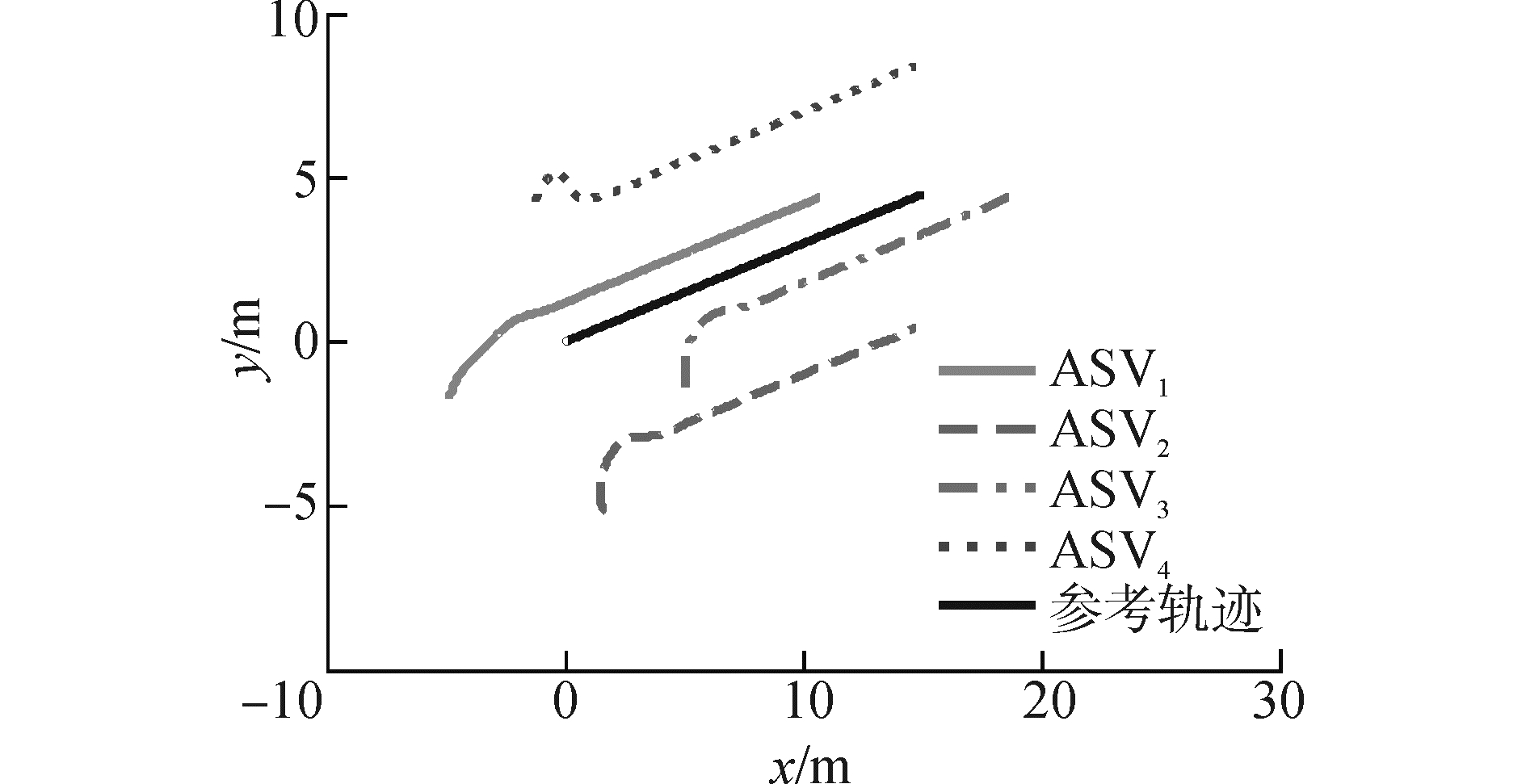 图 3 实时通信与无干扰下各个ASV的运动轨迹 Fig.3 Trajectory of each ASV without considering the communication delay and the external disturbance