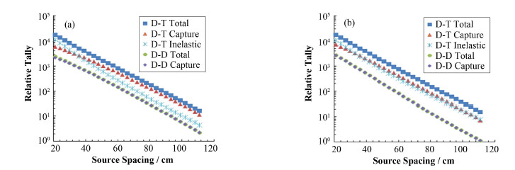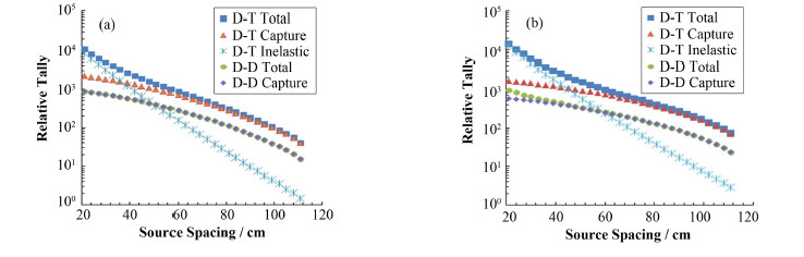 3 D-D与D-T源次生γ对比本文设置D-T发生器的产额为1×108 n∙s-1、D-D发生器的产额为2×107 n∙s-1,则得到的纯灰岩和纯砂岩地层中次生γ射线随不同源距的分布,结果如图 1所示。