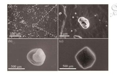 图 4 采用6.0×1025 cm−2He离子辐照后W表面上的几种典型形貌 Figure 4 SEM images of typical topographies on the surface of W irradiated with 6.0×1025 cm−2 He ions. |