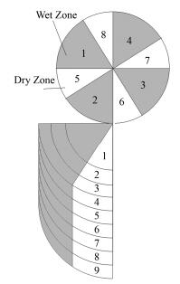 图 2 壳外水膜干湿区划分示意图 Figure 2 Schematic plan of cooling water film distribution. |