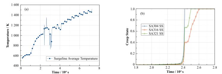 图 5 严重事故下波动管蠕变进程 (a) 波动管管壁平均温度,(b) 三种材料波动管蠕变进程 Figure 5 Creep process of surgeline during severe accident induced by SBO. (a) Volume average temperature of surgeline, (b) Creep processes of surgelines with three different materials |