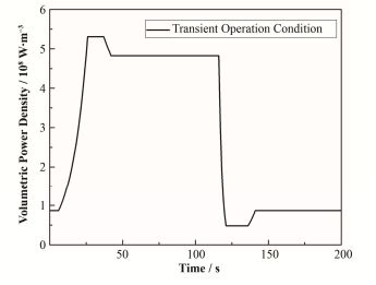 1 计算方案 1.1 运行工况和功率密度假定100%堆功率对应100%负荷(使结果具有保守性),并将功率调节的上限设为118% FP[14](考虑超功率瞬态或操作员误操作)。为简化起见,超功率瞬态传热情况下,燃料芯块体功率密度可近似为随时间呈指数变化(不考虑缓发中子对周期的影响)[1]。本文主要分析船用堆瞬态变工况,对准稳态变工况的模拟仅作为对比之用,不进行详细说明。200 s瞬态变工况为:经20 s将功率从18% FP提升至110% FP,停留10 s,经5 s下降至100% FP,达到稳态后,经5 s从100% FP下降至8% FP,停留10 s,经5 s提升功率至18% FP,达到稳态。燃料芯块体功率密度随时间变化见图 1。反应堆从冷态(温度50 ℃,压力5 MPa)[2]开始启堆,升温升压(按一定的升温速率),10 h后达到18% FP功率运行,进行瞬态变工况,冷停闭反应堆,降温降压(按一定的降温速率),用时10 h,导出余热,整个过程称作一个运行周期。