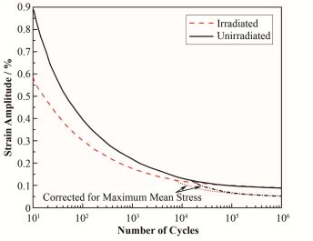 3 结语本文利用ANSYS对船用堆瞬态变工况下的燃料棒进行瞬态热结构耦合分析,得到包壳温度-时间和应变-时间曲线,进而求出包壳在瞬态变工况和运行周期下的疲劳寿命,并分析了包壳温度、冷却剂压力、内压和辐照对包壳疲劳寿命的影响。