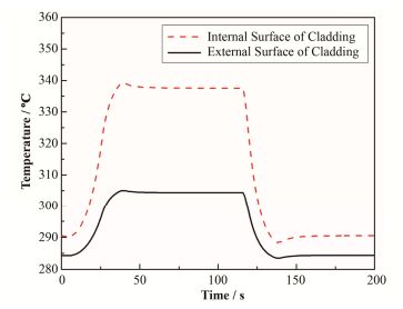 图 5 包壳温度随时间的变化 Figure 5 Temperature of cladding as a function of time. |