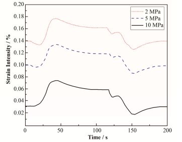 包壳在不同内压下的应变强度随时间变化如图 7所示。瞬态变工况三种不同内压下的包壳应变幅是相近的,这主要由冷却剂压力变化引起的。另外包壳应变强度的峰值不同,随着内压的不断增大,包壳的应变强度是逐渐减小的,主要是因为包壳内外压差减小,引起的机械应变也减小。