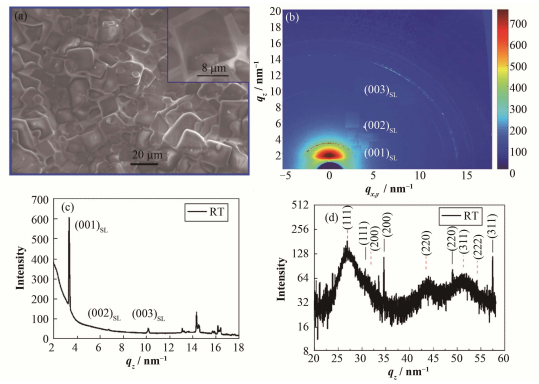图 2 金纳米颗粒的甲醇溶液在氮气中沉积在铜箔上后自然蒸干5 min形成薄膜的SEM (a)、金纳米颗粒薄膜的二维GIXRD (b)二维积分的一维XRD (c)以及金纳米颗粒薄膜面外GIXRD (d) Figure 2 SEM image of Au NP film on copper substrate (a), 2D-GIXRD image (b), the integrated diffraction pattern (c), out-of-plan GIXRD of Au NP film on Cu substrates (d). |