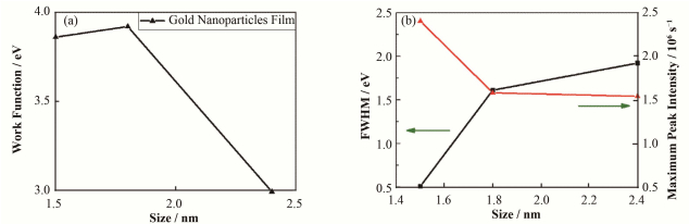 图 6 不同尺寸粒径Au NP薄膜的功函数(a)、二次电子发射峰半高宽和最高峰强度(b)的对比 Figure 6 Work function (a), FWHM and maximum peak intensity (b) of Au NP film secondary photoemission peak derived as functions of the Au NP size. |