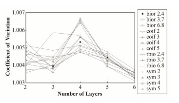 表 2中,变异系数最高值为1.00665,对应为rbio3.7的4层分解。为更直观体现变异系数的变化趋势,将变异系数绘制折线图,如图 2所示。