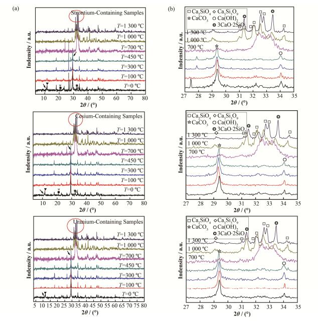 图 5 含Sr、Cs、U三类地质水泥固化体在热处理前后的XRD对比图(a)各类水泥固化体的XRD图谱,(b)椭圆标示放大图 Figure 5 Comparison of XRD patterns of cement geological cement waste forms containing Sr, Cs and U before and after heat treatment. (a) XRD patterns of various cement waste form, (b) Oval sign magnified figure |