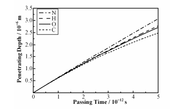 图 3 能量为30 keV的N+与不同靶原子碰撞的穿行时间与平均穿行深度的关系 Figure 3 Relationship between the passing time and the average penetrating depth of 30 keV nitrogen ions collision with different target atoms |