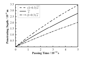 当选取穿行时间为t=4×10-12s时,根据以上数据,代入式(13),容易计算出30 keV的N+在糙米种子内的平均穿行深度为2.20×10-6m。