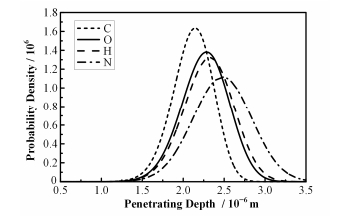 图 5 N+分别与不同靶原子碰撞的穿行概率密度曲线(E=30 keV, t=4×10-12s) Figure 5 Fig. 5 Probability density curves of 30 keV nitrogen ion collision with different target atoms at the moment of t=4×10-12s |